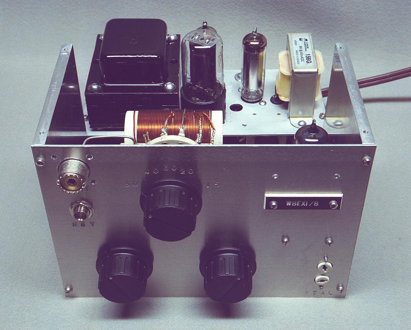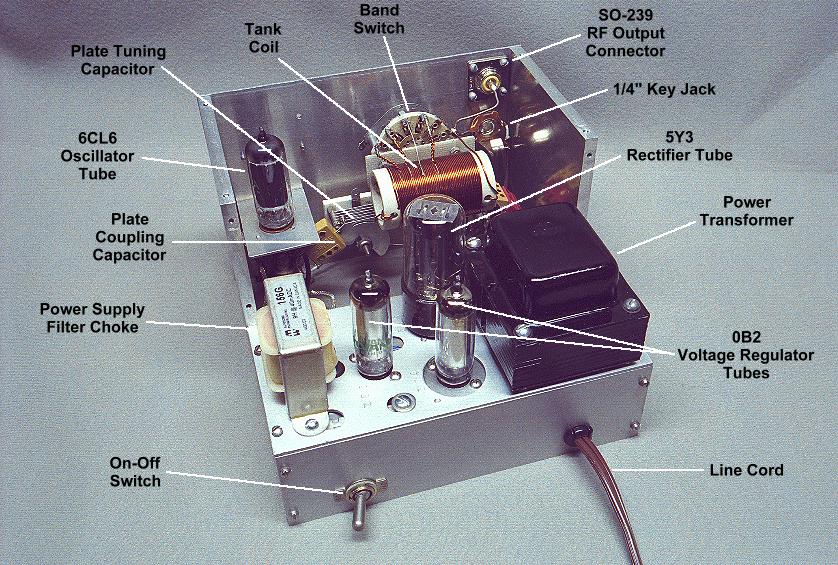 | Rear View: This is a rear view of the transmitter with the top and middle panels removed to reveal the interior of the transmitter. At the rear the power supply deck is clearly visible. It contains, from left to right, the power tupply choke, 1st 0B2 regulator tube, 5Y3 rectifier tube, second 0B2 regulator tube, and power transformer. The RF components are mounted on the front panel. From left to right the 6CL6 oscillator tube, plate coupling and plate tuning capacitors, bandswitch and RF tank coil, and output connector and key jack, are visible. |