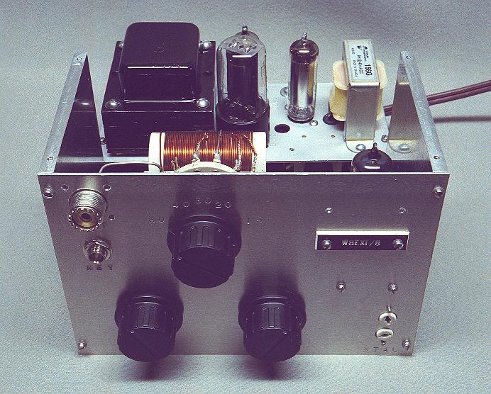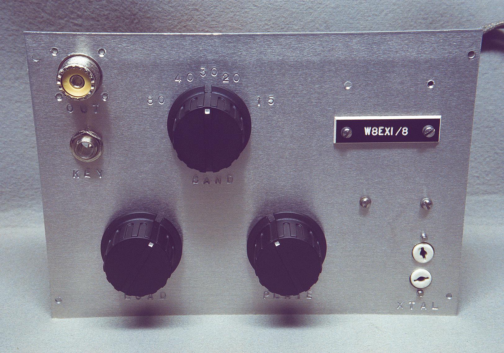 | Front Panel: The front panel is machined out of brushed aluminum. Knob and jack functions are stamped directly into the aluminum with 1/8" high metal stamps. The transmitter is bandswitched and covers 80, 40, 30, 20, and 15 meters. The band switch is the knob in the middle. At the upper left are the SO-239 RF output connector and the 1/4" key jack. The two knobs on the bottom adjust the pi-network matching circuit. The knob at lower left is the antenna loading adjustment, and the knob at lower right is the plate tuning adjustment. The crystal socket is the white ceramic socket at the lower right. Since Jim, W8EXI, had originally built parts of the transmitter and had mounted a laminated callsign plaque on the transmitter, I decided to retain his plaque and eventually add a plaque with my callsign as well. |