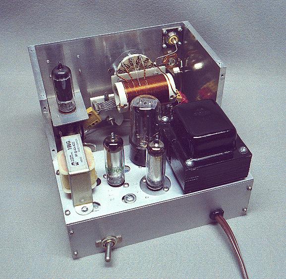 | Front View: In this front view of the transmitter, the top and middle panels have been removed. Across the back is the power supply deck containing, from left to right, the power transformer, 5Y3 rectifier tube, OB2 regulator tube, and power supply choke. Another OB2 regulator tube is just baerly visible behind the 5Y3 tube. At the front, just visible behind the front panel, are the red tank coil and band switch on the left and the top of the 6CL6 oscillator tube on the right. |