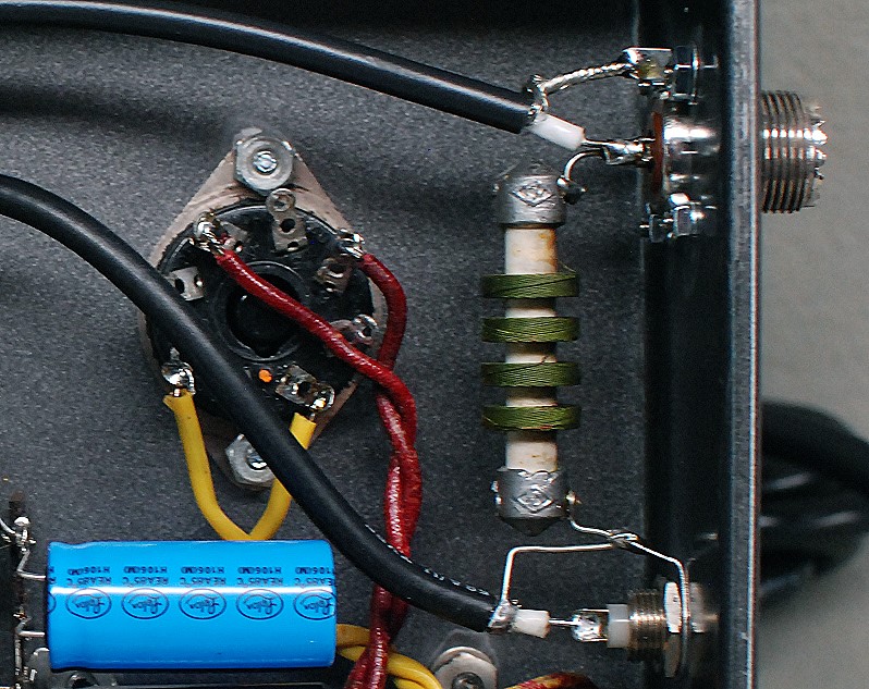 | Power Switch, Key Jack, and Power Supply Choke: The power switch and key jack are mounted on the front panel of the amplifier, which is to the left in the photo. The key jack is wired so that it keys the amplifier when when no plug is inserted in the jack. The key jack is bypassed with a 0.001uf capacitor to prevent any stray RF from entering or leaving through the jack. The power supply filter choke is at the bottom of the photo. This is a 65mA, 8H choke made by the SNC Manufacturing Co. The ceramic disc capacitor partly visible at the top of the photo is the 0.0047uf plate coupling capacitor. |