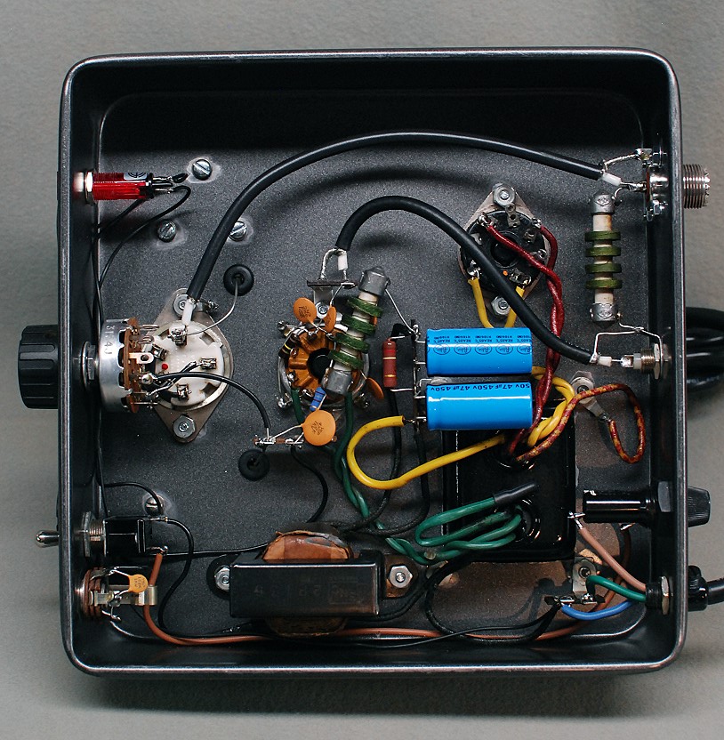 | Overall View: In this overall view of the amplifier wiring the front is at the left and the rear is at the right. At the left, mounted on the front of the amplifier, from bottom to top, are the key jack, on/off switch, band switch, and pilot light. Leads running from the bandswitch to the coil socket are kept as short as possible to minimize stray inductance. Wires to the plate tuning and load controls pass through the chassis via grommeted holes and are also kept as short as possible. The socket near the center of the chassis is for the 6AG7 amplifier tube. All connections are kept as short as possible. The green plate RF choke obscures the 47k screen dropping resistor and some of the other connections to the 6AG7 socket. Directly to the right of the RF choke are the 120k bleeder resistor and the blue power supply filter capacitors. The power supply filter choke, which looks like a small transformer, is slightly to the left at the bottom of the photo. At upper right is the socket for the 5Y3 rectifier tube, and directly below the 5Y3 socket is the power transformer, partly hidden by the blue filter capacitors. At the right, mounted on the back panel, from bottom to top, are the line cord, fuse, input connector and output connector. Coaxial cable is used to connect the input and output connectors to the appropriate parts of the circuit. The use of unshielded wire could lead to instability and unwanted parasitic oscillations. At the extreme upper right is the green output RF choke. Compare the wiring in this photo to the wiring in the prototype. (In the prototype, little attention was given to proper lead dress or soldering techniques.) |