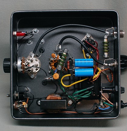 | 6AG7 Socket and Filter Capacitor Wiring: The 6AG7 socket is near the middle of the chassis. In this close-up the front panel is to the left and the rear panel is to the right. Pin 1 on the tube socket is just to the left of the blue resistor. Pin numbers increase in the clockwise direction. At the top of the photo a coaxial cable brings the signal in from the input connector on the back panel. Coaxial cable should always be used for such connections, otherwise stray coupling and instability can occur. The green plate RF choke dominates the center of the photo. The blue 180 ohm cathode bias resistor (brown-gray-brown) can be seen near the bottom end of the RF choke. The large brown resistor to the right of the RF choke is the 120k ohm bleeder resistor (brown-red-yellow). The large blue capacitors are the 47uf power supply filter capacitors. The large yellow wire attached to the bottom filter capacitor runs to the center tap of the 5V filament winding on the power transformer. The large twisted green wires connected to pins 2 and 7 of the tube socket run to the 6.3V filament winding on the power transformer. The 47k screen dropping resistor is underneath the RF choke and is not visible in the photo. The brown 100k ohm grid resistor (brown-black-yellow) is on the left side of the tube socket. The ceramic disc capacitor at the bottom of the RF choke is the 0.0047uf plate coupling capacitor. It is connected to a tie point to its left where a curved black wire carries the output signal to the band switch. Another wire connected to the tie point runs through a grommeted hole in the chassis to the plate tuning capacitor. Note how all connections are kept as short as possible to minimize stray inductance and capacitance. |