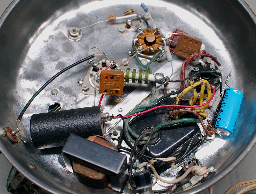 | Bottom View: What a mess! Believe it or not, this actually works. While testing the amplifier I did not pay much attention to lead dress or proper soldering techniques. The goal was to simply get the thing working and to work out the bugs in the design. The large black capacitor is a very old junk box capacitor I used in the power supply to get the power supply working. It had a voltage rating lower than I would have liked, but it held up. The transformer wiring was very filthy, and part of the transformer restoration involved carefully removing all of the grime from the transformer leads. In this photo the white socket near the center is the coil socket, the burnt-orange octal socket is the 6AG7 socket, and the black octal socket is the 5Y3 socket. The power supply filter choke is slightly to the left at the bottom of the photo. |