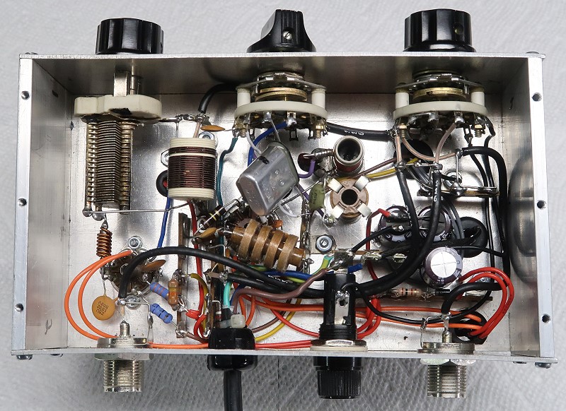 | RF Amplifier: A 6BA6 is used as the RF amplifier. Except for the input and output coupling this RF amplifier circuit is the same as the IF amplifier circuit in the 6x2 superheterodyne receiver. The 6BA6 tube socket is located in the center of the picture. Input RF choke RFC1 wound on resistor R2 can be seen at top left. The output connector can be seen at bottom center. Note the method used to attach the coax to the connector. The coax shield is removed until only 1/8" is left. Solid hookup wire is then wrapped around the shield, trimmed, and then carefully soldered. The hookup wire is then connected to the appropriate point. This results in a sturdy, secure connection that prevents the end of the coax from moving. |