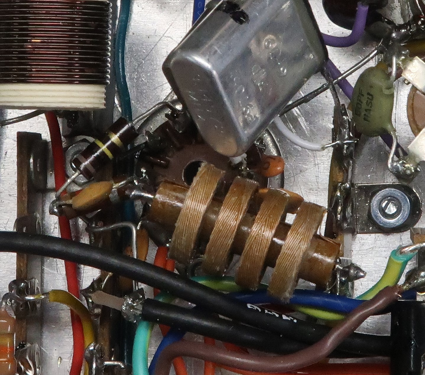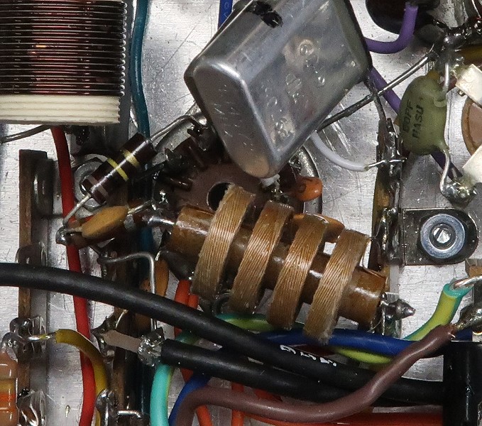 | Mixer: The wiring in the 6x2C converter is very tight. This is particularly true around the 6GH8 mixer/oscillator. The tube socket can barely be seen at the center of this photo. RF choke RFC2 (bottom) and crystal Y1 (top) dominate the photo. Crystal Y2, which is smaller than Y1, can barely be seen underneath Y1. The output coaxial cable can be seen connected to the output of the mixer at lower left. (The coil at top left is the input coil L1, not L2, the mixer coil, which is on top of the chassis.) |