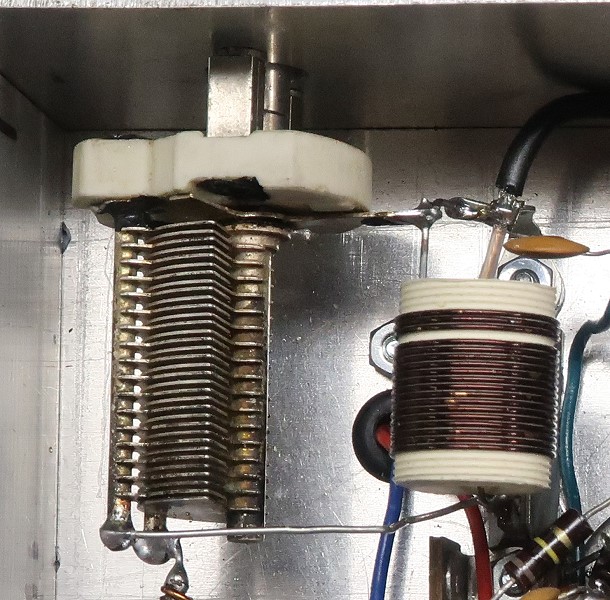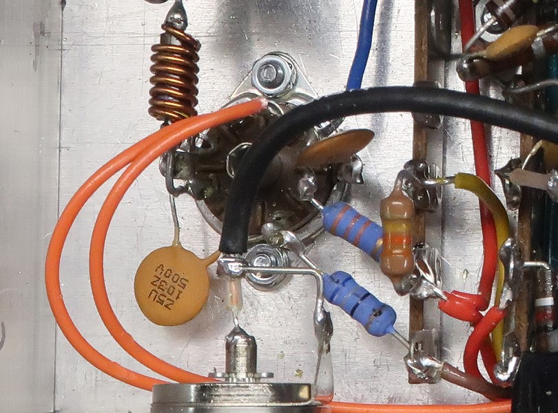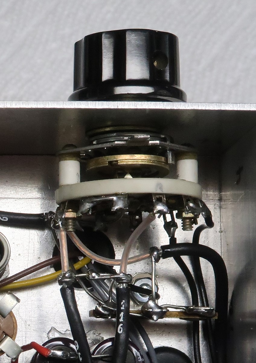 | Band Switch: The band switch is a ceramic Centralab 3 pole-3 position rotary switch. Only two poles are used. The switch also has a position limiter that is set so that it only has two positions. One pole switches between Y1 and Y2, and the other pole switches between L3 and L4. |