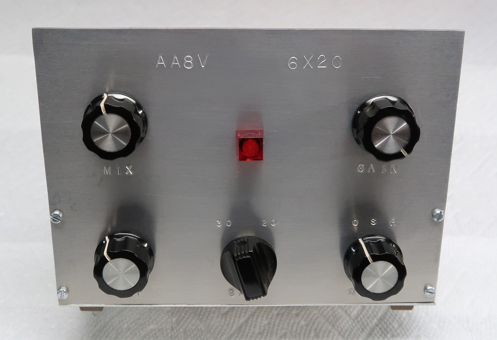 | Front View: The 6x2C converter is a 2 tube crystal controlled converter for the 30m and 20m bands. .When used with the 6x2 receiver the system comprises a 4 band double conversion superheterodyne receiver. The 6x2C covers the 30m band and the bottom 90 kHz of the 20m band. The 6x2 receiver covers 3500 kHz to 3850 kHz and 6900 kHz to 7250 kHz. When used with the 6x2C the frequency conversion is as follows: 30m: Input: 10100 kHz to 10150 kHz Output: 6954 kHz to 7004 kHz 20m: Input: 14,000 kHz to 14,090 kHz Output: 3760 kHz to 3850 kHz The input frequencies are perfect for a CW operator. The unusual output frequencies are the result of the only suitable crystals (3146 kHz and 10240 kHz) I was able to find over several years of searching. The front panel is brushed aluminum. Control functions are embossed into the panel using metal stamps. The two controls at left are the mixer grid tuning and antenna (RF amplifier grid) tuning. The band switch is at bottom center, and the RF gain control is at top right. The mode switch at bottom right has three positions as follows: Off: Power is off and the input is fed directly to the output. Standby: Power is on and the input is fed directly to the output. Run: Power is on and the converter circuit is switched in between the input and output. |
