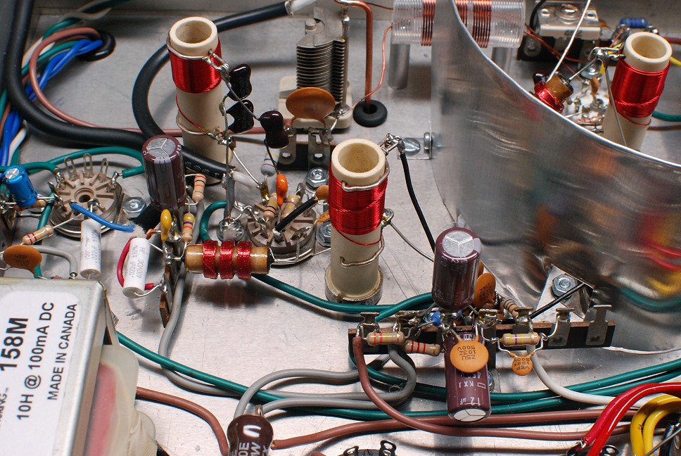 | Audio Preamplifier - Detector/BFO - IF Amplifier: In this photo, taken from the back of the receiver, the IF amplifier, BFO/detector, and audio preamplifier, can be seen from right to left. The mixer/local oscillator can be seen behind the metal shield at the upper right. The IF signal, after passing through the crystal filter, passes through an opening in the metal shield and is fed into the IF amplifier on the right. The terminal strip at the lower right contains part of the IF amplifier. The IF amplifier tube socket is behind the terminal strip and is hard to see in the photo. The output of the IF amplifier appears in the red and white coil in the middle of the photo. The 6CG7/6FQ7 detector/BFO tube socket is in the center of the photo. The red and white coil at the upper left is the BFO coil. The IF signal and BFO signal are fed into the detector/BFO, and the audio output passes through the red RF choke in the middle of the photo through a shielded cable to and from the AF gain control. The audio comes back from the AF gain control and is fed into the 12AX7A audio preamplifier on the left. It then passes to the audio power stage, which is behind the large power supply choke at the lower left and cannot be seen. |