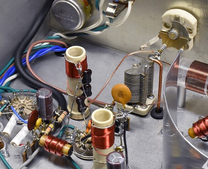 | Modifications to the BFO and Audio Detector: After the receiver was built it was found that the BFO drifted excessively. It took a while to track down the problem, but part of the source turned out to be the coaxial cable connecting the front panel BFO control to the BFO oscillator tube. The capacitance of the cable changed with temperature and altered the frequency of the BFO. When the coaxial cable was removed and replaced with a simple copper wire, the drift was reduced. To see the difference, note the connection to the white BFO trimmer capacitor at upper right in this photo and the one above. (Note: In this photo, the BFO capacitor and vertical HF oscillator trimmer capacitor look like they are connected together. This is due to the angle from which the photo was taken. They are not, in fact, connected together. Their separation can be clearly seen in the photo above.) The remainder/majority of the BFO drift was caused by the copper slug used in the coil and the position of the slug, which was just at the edge of the coil winding. Extra capacitance (about 110pf, not seen in this photo) was added across the complete coil winding (L8) and this placed the slug near the middle of the winding, rather than at the edge. (With a copper slug coil, the inductance goes down (and frequency goes up) as the slug is inserted in the coil.) This cured the drift and resulted in a stable BFO. After using the receiver for a while it was found that the audio frequency response of the receiver was too large. Excessive high frequency response allowed undesirable hiss and noise to reach the output of the receiver. To limit the high frequency response, the capacitance between the output of the detector and the input to the audio gain control was increased from 0.002 uf to 0.012 uf. This greatly reduced the noise and hiss while leaving the response between 300 Hz and 3 kHz unaffected. Rather than removing the original capacitor, an additional 0.01 uf capacitor (brown) was soldered in parallel with the original capacitor (yellow). The two capacitors can be seen next to each other, just to the left of the RF choke in the lower left corner of the photo. |