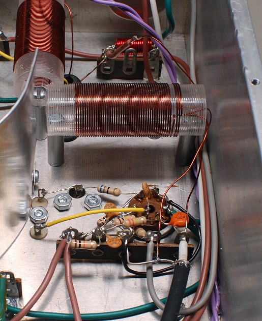 | Input Tuned Circuit and Mixer: The mixer is designed so that it will respond to signals in both the 80m and 40m bands at the same time, without any changes in the local oscillator. This greatly simplifies construction and results in a more stable local oscillator, but it requires a very selective tuned circuit at the input that can reject one band while passing the other. A single tuned circuit lacks the selectivity needed to reject the 40m band while passing the 80m band and vice versa, so two tuned circuits are used. These are tuned by the band select capacitor on the top side of the receiver. The two coils, visible at the right in the photo, are mounted at right angles to each other to prevent stray coupling between them, resulting in better overall selectivity. Also visible in this photo at the top on the front panel are, from left to right, the BFO frequency control (white), CALibrate/WWV control (orange), pilot lamp, and IF gain control. The mixer and local oscillator components are at center and left and will be discussed below. |
