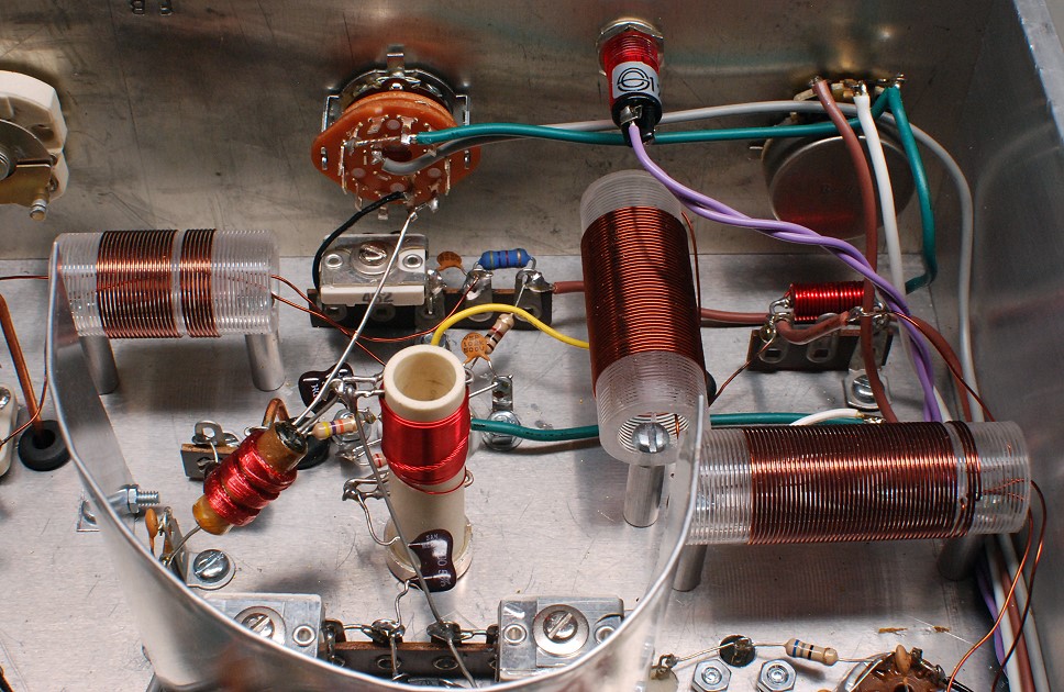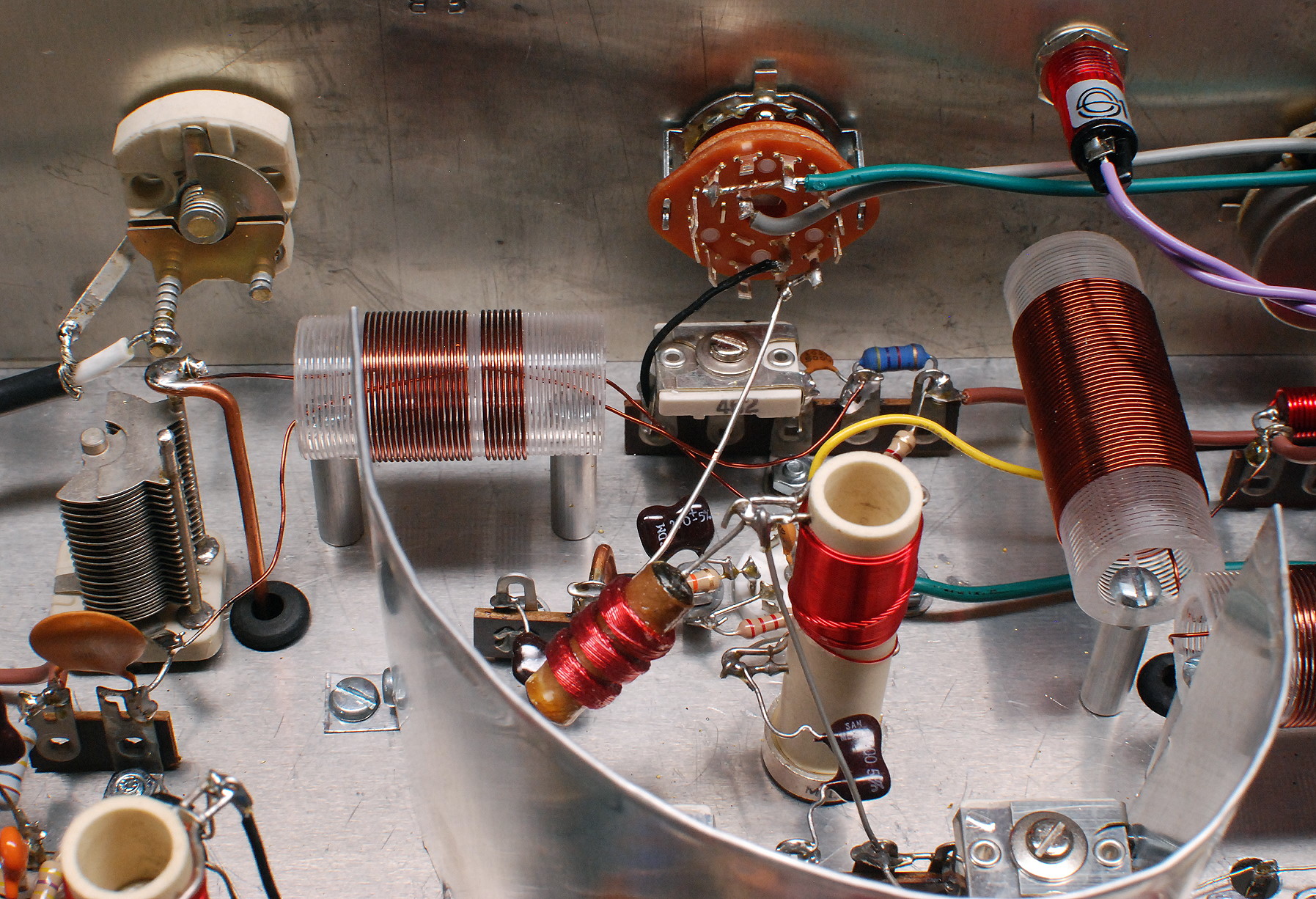 | Audio Preamplifier and Detector/BFO: This is a picture from the other side of the audio amplifier and detector, taken from the back of the receiver. The 6AQ5A audio amplifier socket is not visible because it is hidden behind the power supply choke at bottom left. The red RF choke in between the red and white coils is part of the circuit that removes any radio frequency energy from the output of the detector. The choke blocks the RF while permitting the audio to pass through. The AF gain control can just be seen at the left on the front panel at the back of the photo. To the right of the AF gain control on the front panel (at the upper right in the photo) is the BFO control, which is a very small variable capacitor. Just in front of the BFO control are the local oscillator trimmer capacitor and coil. The red and white coil at the lower right is the output of the IF amplifier. |