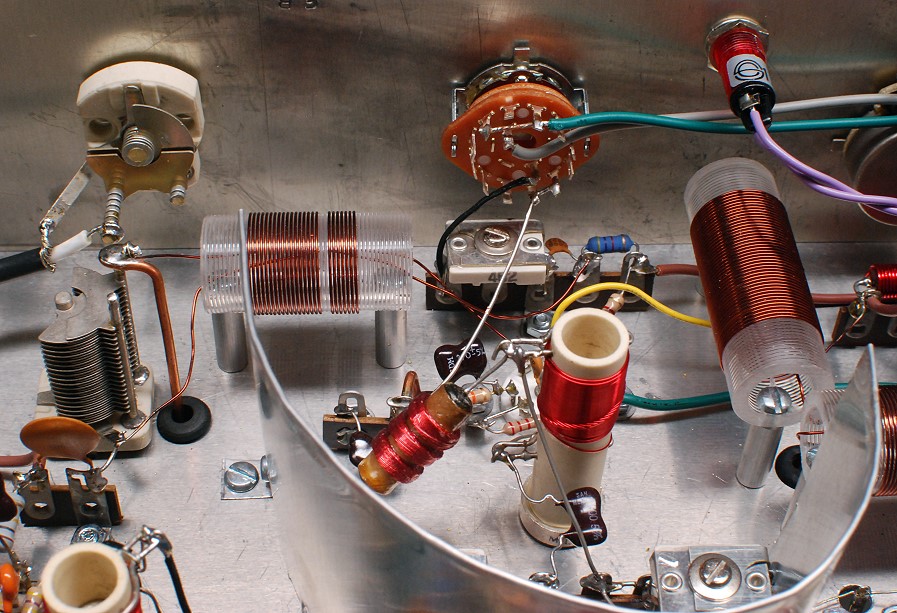 | Crystal Calibrator: A 6BA6 is used as a crystal calibrator in this receiver. The design is taken directly from the Drake R4A receiver. The crystal calibrator produces a 100 kHz (0.1 MHz) signal very rich in harmonics. These harmonics extend all the way up to 30 MHz and serve as marker signals every 0.1 MHz on the receiver dial. The calibrator can be trimmed so that its 50th harmonic is zero beat with WWV at 5 MHz. The calibrator is then accurate to about 2 parts in 5 million. The output of the calibrator is coupled through a 1.0 pf capacitor (orange, bottom right) to the signal coming from the RF input via a black coaxial cable (bottom right). From there the input signal and the signal from the crystal calibrator (if turned on) run to a three turn link on the input coil, visible above the tube socket in the photo. The input coil steps up the impedance from the low impedance of the antenna to the high impedance of the mixer input. The input coil is also tuned to the band in use by the band select capacitor on the top of the chassis. |