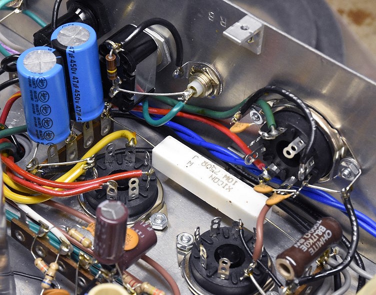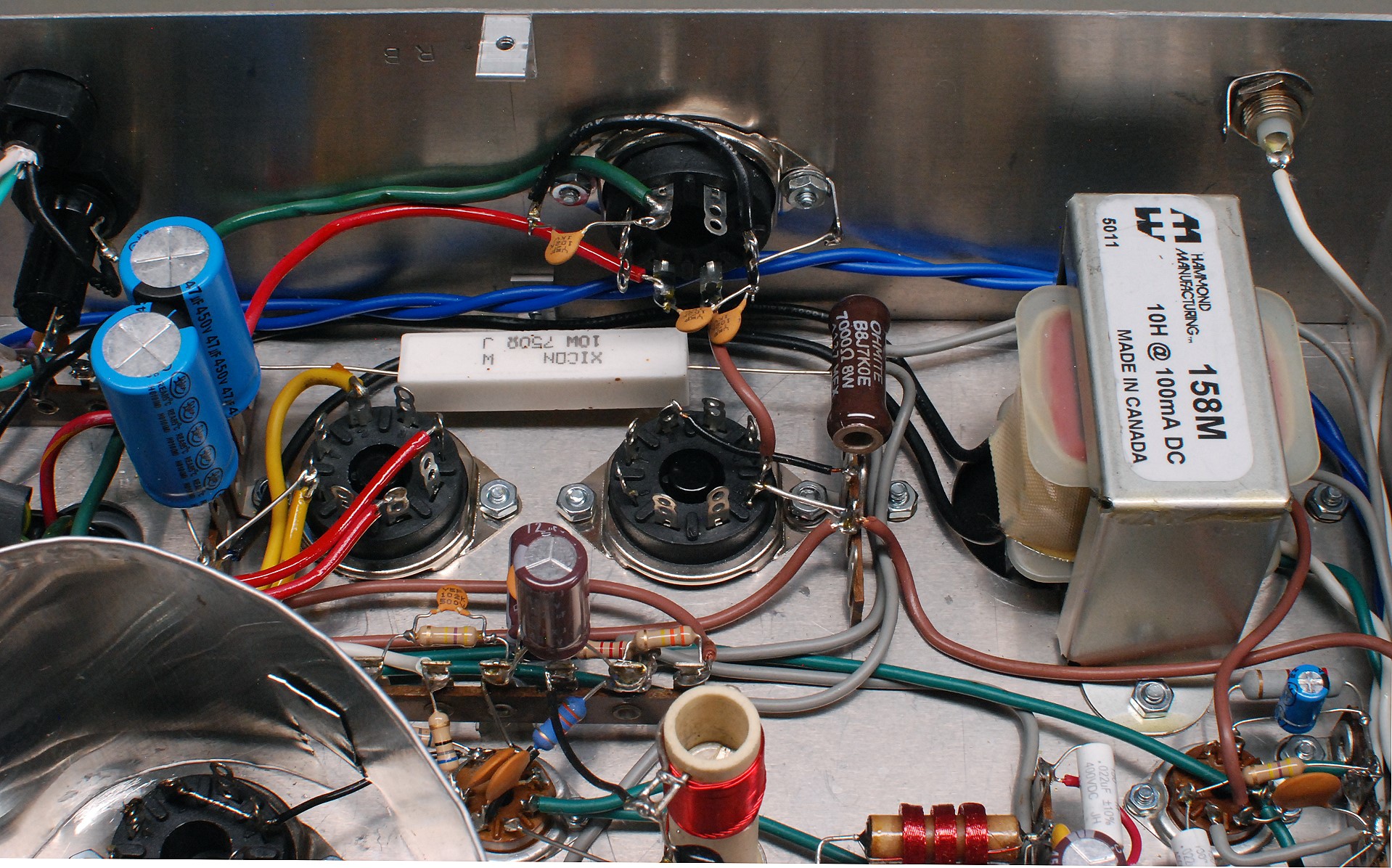 | Power Supply: The 6x2 receiver uses a power supply with a conventional, full wave, center tapped rectifier. A 5Y3-GT can easily handle the power needs of the receiver. The 5Y3-GT socket is the octal socket on the left. The yellow leads connect to the 5V filament winding of the power transformer, and the red leads connect to the high voltage winding of the power transformer. A capacitor input filter is used with a single 10 H power supply choke, which is visible on the right. The filter capacitors are the blue units on the left. A 750 ohm, 10 watt power resistor drops the output of the power supply to 250V under normal operating conditions. A 7 kohm 8 watt resistor and 0C3 VR tube (octal socket to the right of the 5Y3-GT socket) provide 108 volts regulated for the 6U8A local oscillator, 6U8A mixer screen grid, and 6CG7/6FQ7 BFO. An octal accessory jack on the back panel (top center in photo) allows the power supply to also power accessories that do not require much power, such as an electronic T/R switch, preamplifier, or frequency converter. At the bottom of the picture near the center the IF amplifier can be seen and the tube socket at the lower right is the 6AQ5A audio power amplifier. Connections to the audio output transformer are underneath the power supply choke on the right. The octal socket for the crystal filter is barely visible behind the metal shield at the lower left. |