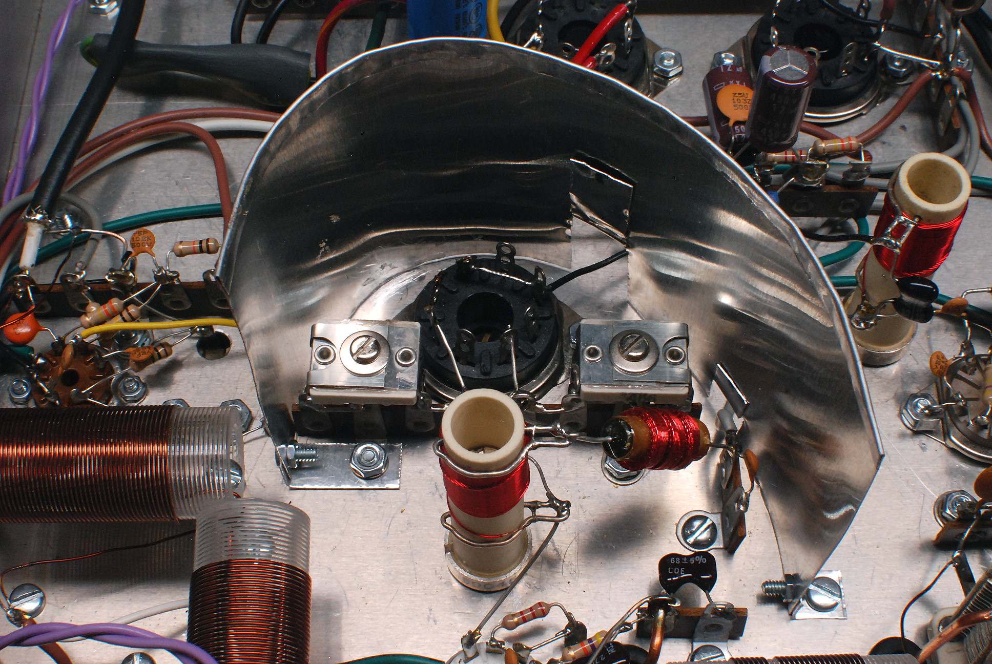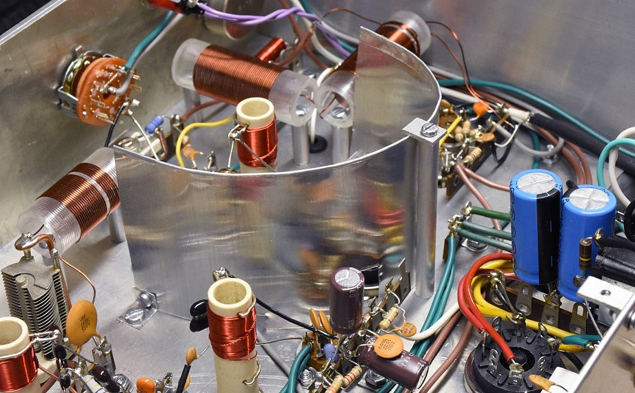 | IF Amplifier - Detector/BFO - Audio Amplifier: After passing through the crystal filter, the signal is fed into the IF amplifier, which is at the upper left in the photo. The IF amplifier uses a 6BA6 to amplify the IF signal by 6 dB to 31 dB, as determined by the setting of the IF gain control on the front panel. The IF amplifier can also be completely turned off by placing the receiver in standby mode. The output of the IF amplifier appears across the red and white coil at the upper left in the photo, and is then fed into the BFO/detector, which is in the middle of the photo. The BFO uses one triode of a 6CG7/6FQ7 to generate a signal at approximately 1700.7 kHz. The actual frequency is adjustable over several kHz by the BFO control on the front panel. The red and white coil in the center of the picture is used in the BFO, and is adjusted so that when the BFO control on the front panel is at the middle of its range the BFO oscillates at 1700.0 kHz exactly. The BFO control on the front panel is connected to the circuit via the large black coaxial cable on the left. The signal from the BFO and the output of the IF amplifier are fed into the other triode section of the 6CG7/6FQ7, which functions as a second mixer/detector. The signals mix together and their sum and difference appear at the output of the detector. In CW mode the difference is an audio tone at 0.7 kHz (700 Hz), which is easily separated from the RF signals at the output of the detector. In SSB mode the output is the recovered audio. The audio output of the detector passes out to the AF gain control on the front panel and back to the input of the audio preamplifier via the large shielded black cable on the right. The audio preamplifier uses one triode section of a 12AX7A. This is the 9-pin socket at center right in the photo. (The other section of the 12AX7A is not used.) After passing through the audio preamplifier the signal is then fed into a high quality audio power amplifier using a 6AQ5A power pentode, which is the 7-pin socket at the upper right in the photo. With a large, oversized, 10 watt audio output transformer, the 6AQ5A power amplifier easily develops over 4 watts of clean audio power. |