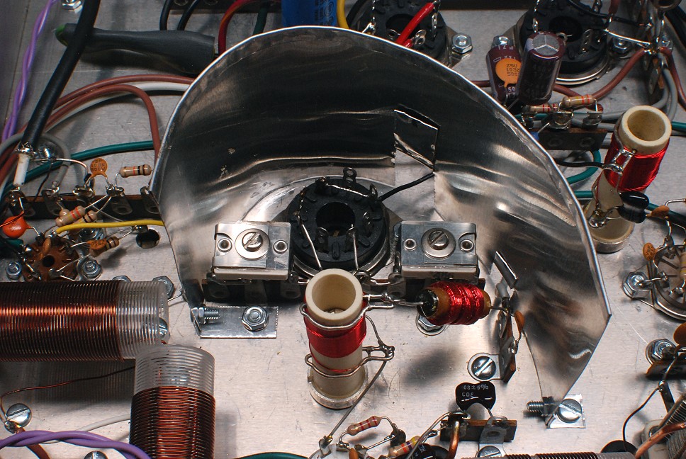 | Crystal Filter: The crystal filter gives the receiver its ultimate selectivity. The crystal is a 1700 kHz unit in an FT-243 holder. A 50 pf phasing capacitor is also used. The crystal and phasing capacitor are plugged into the octal socket on the top side of the receiver. See the Exterior Photos page for pictures of the crystal and phasing capacitor on the top of the chassis. In this photo the octal socket is in the center, and the two 480pf trimmer capacitors that are part of the crystal filter can be seen on either side of the octal socket. A capacitance meter is used to set these two capacitors to the same, maximum, capacitance. It is very important that these two capacitors be matched as closely as possible. The phasing capacitor on the top of the chassis is adjusted for the best selectivity. The red and white coil at bottom center is the mixer output coil. The other red and white coil, at the upper right, is the IF output coil. Since these are both tuned to the same frequency and are not shielded, they could couple together producing unwanted feedback. To prevent this, and to prevent any IF signal from leaking around the crystal filter, a curved aluminum shield is inserted between the crystal filter and the rest of the receiver. The IF signal passes through a small opening in the middle of the shield (small black wire) to the IF amplifier. |