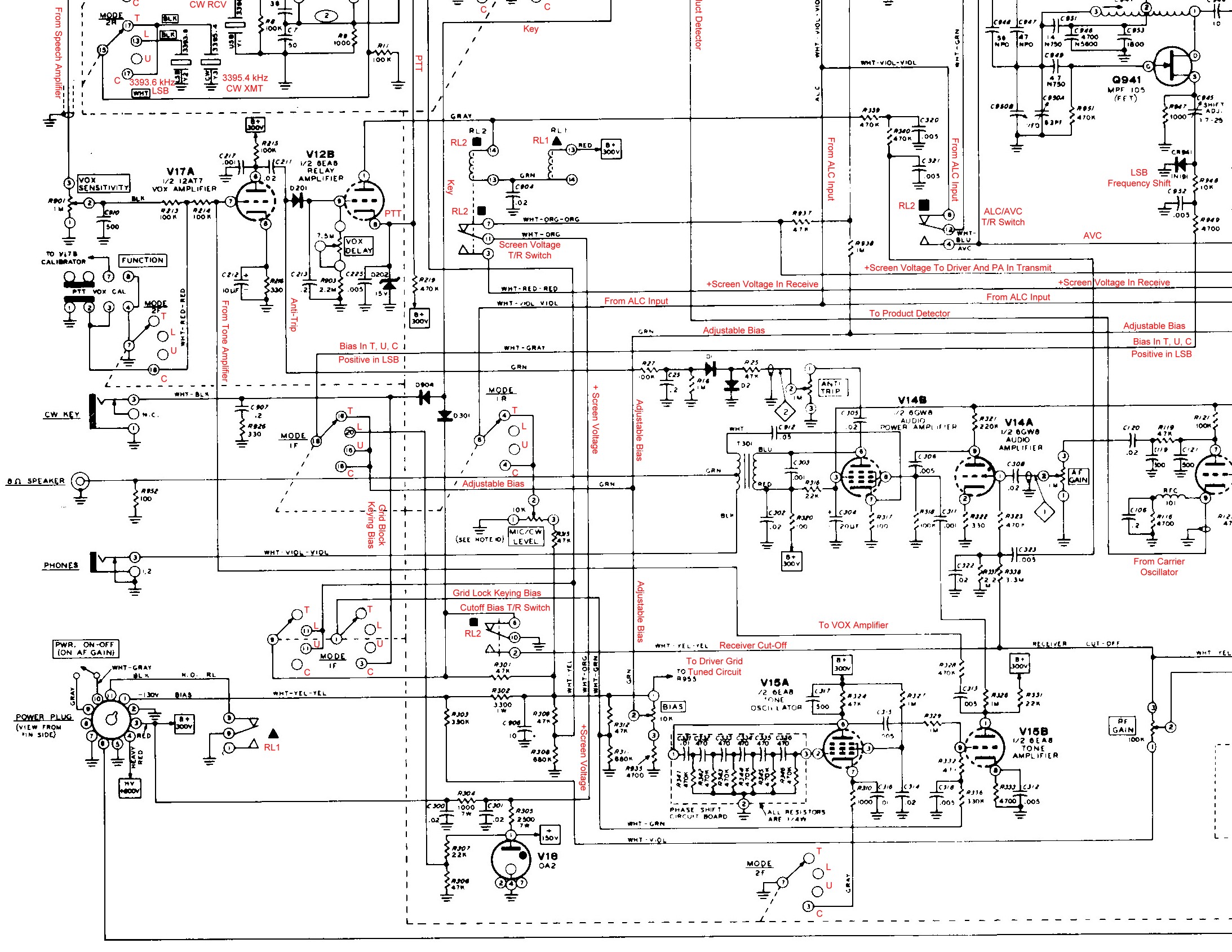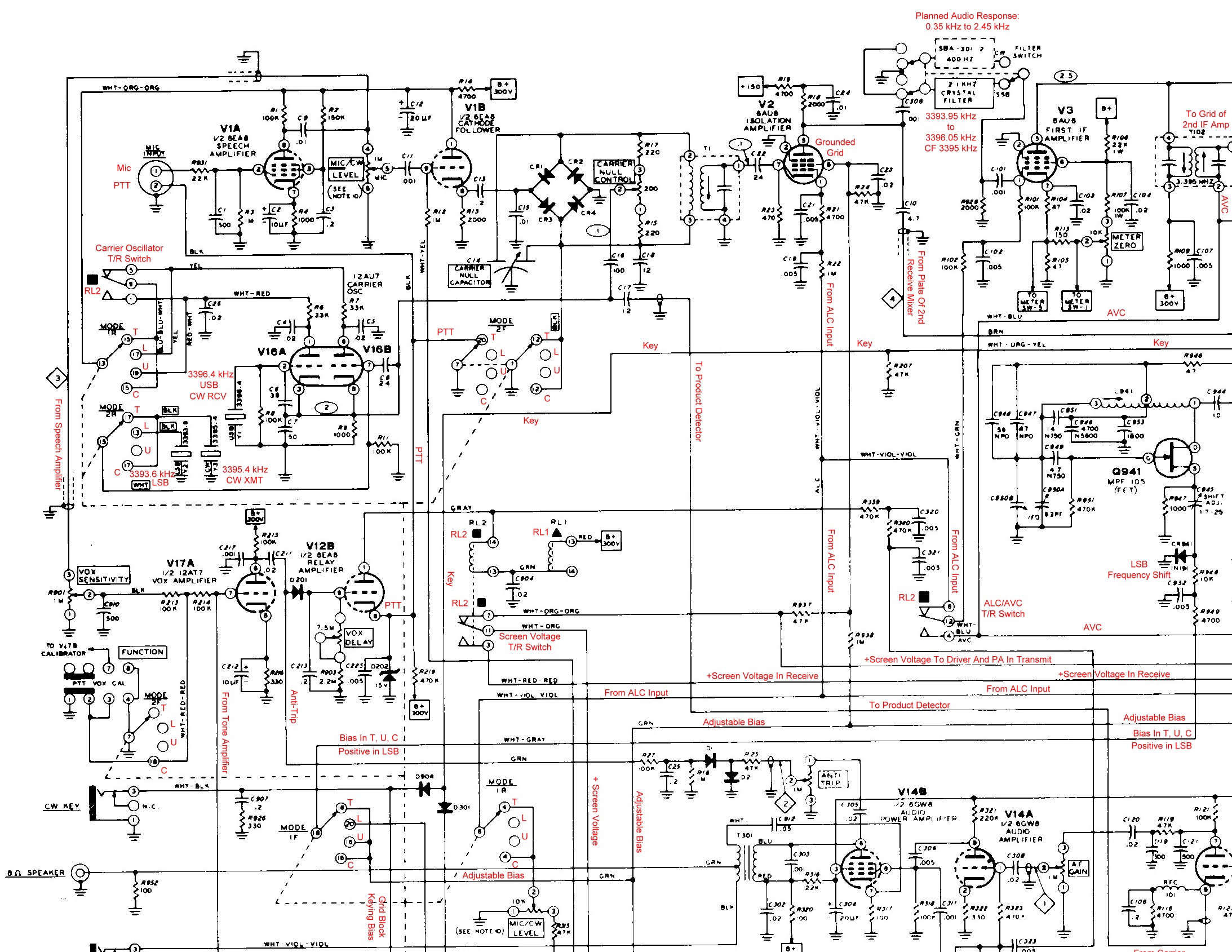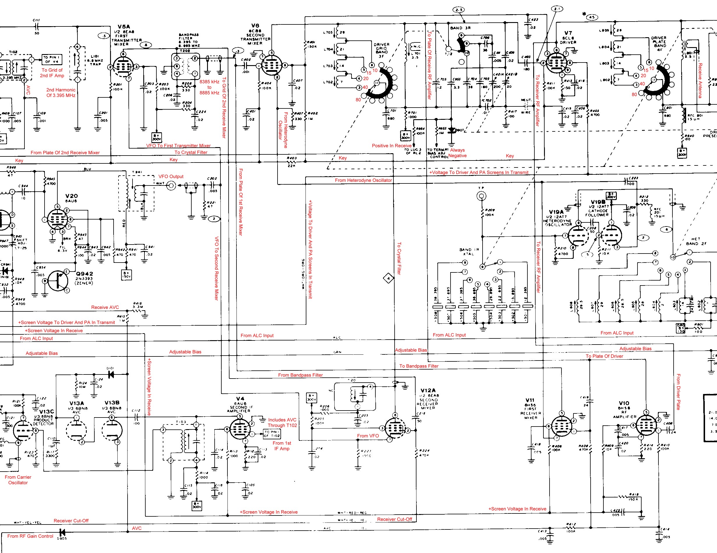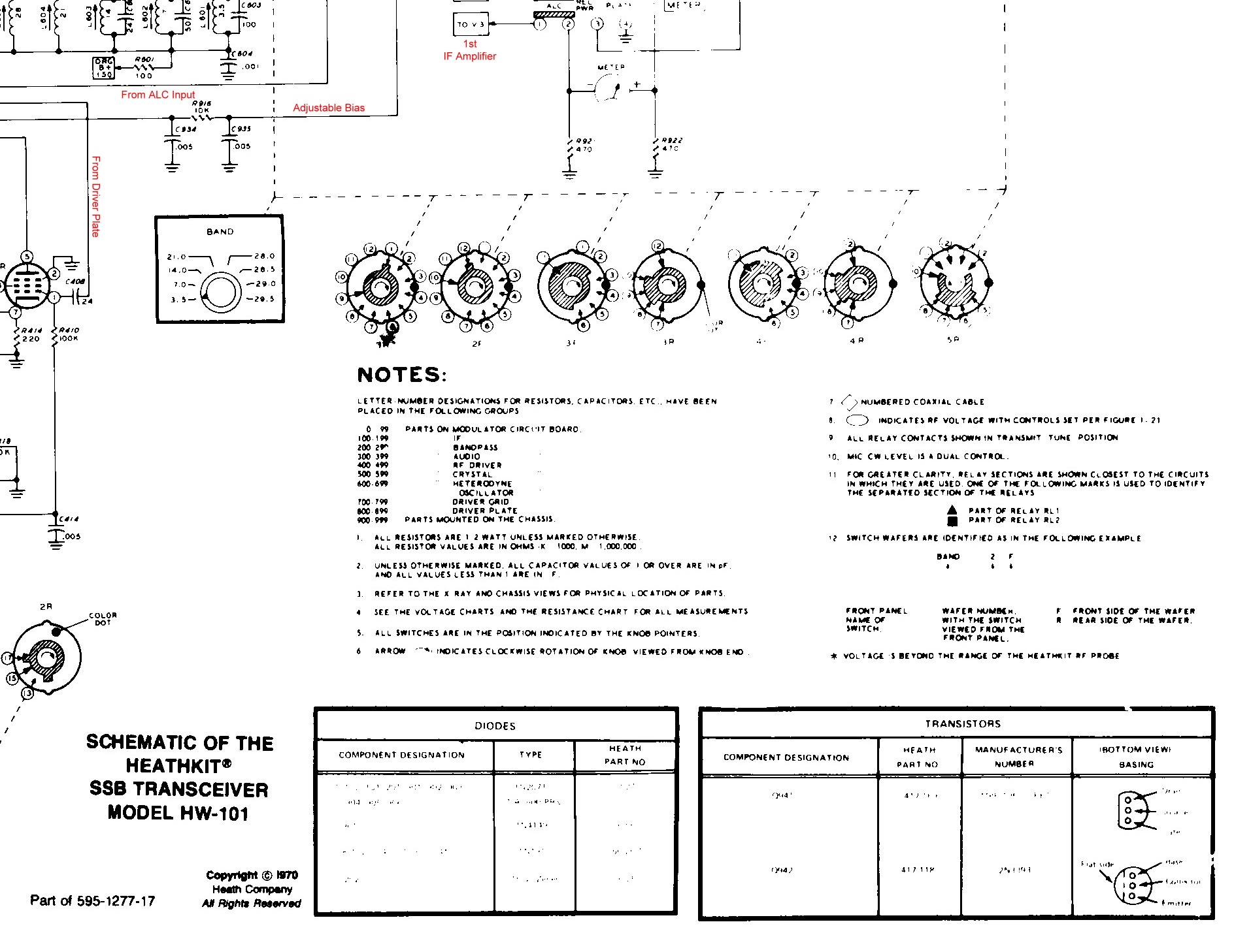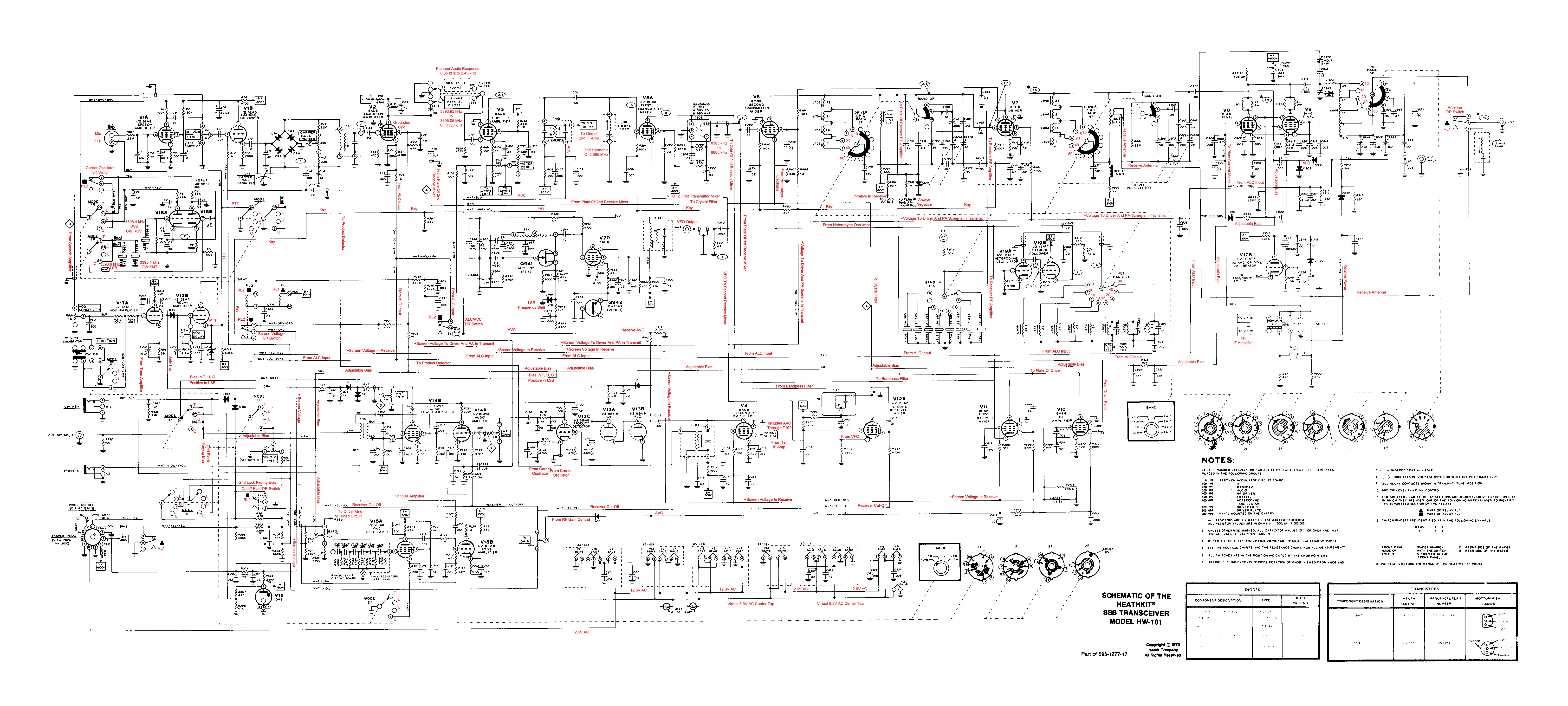 Though the complete schematic diagram can be found in the Heathkit HW-101 Manual (file pages 239, 240, and 241) the diagrams here are notated and much easier to follow. The sectional schematics are formatted to print well on 8 1/2" x 11" paper in landscape mode. Since the notations are in red, the schematics should be printed in color, if possible.