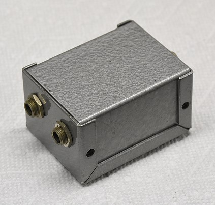 | Two Transistor Buffer Amplifier: The output of the LM-13 is very low. To bring it up to a level where it can be used as a VFO, a two transistor broadband amplifier is used. The amplifier is contained in a small 1.5"H x 2"D x 2 3/4"W minibox and runs off of a 12 V wall wart. Though RCA jacks would be better, 1/4" phone jacks were used for the input and output since the surplus minibox I used already had them installed. You can learn about the construction and operation of the buffer amplifier by going to the Two Transistor Buffer Amplifier page. |