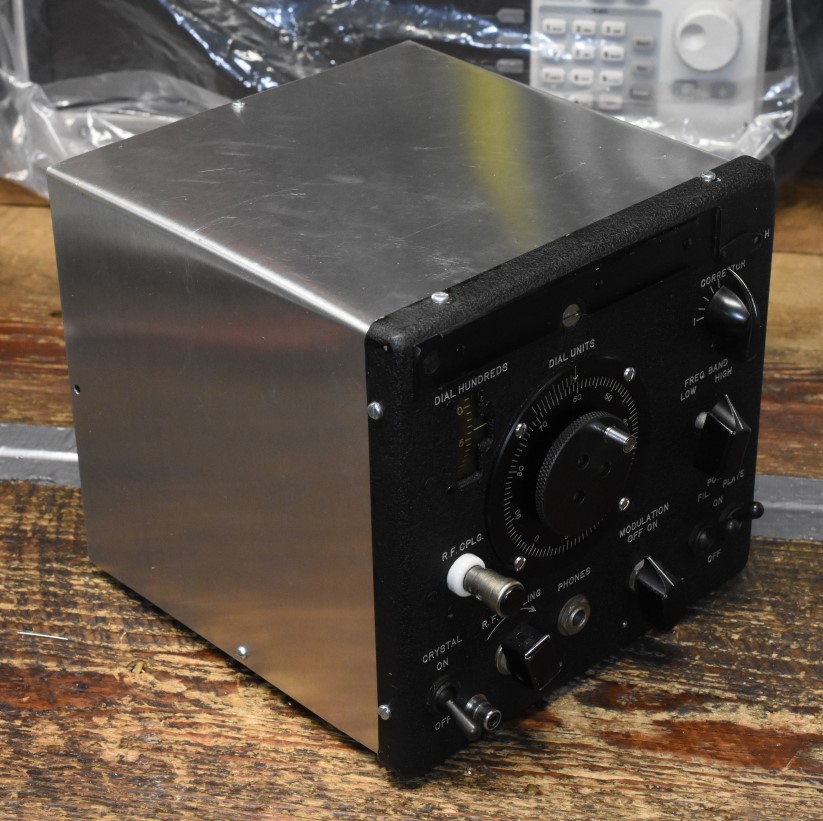 | LM-13 Front Panel After Restoration: When I closely inspected the wiring and made checks with an ohmmeter I found a loose connection in the oscillator. This was very easy to get to and was quickly repaired. Further checking showed that the filament circuit had been modified for 6 V operation, rather than the original 12/24 V operation. A temporary power supply was quickly put together and the LM-13 was found to operate beautifully. The oscillator was stable and produced a clean signal. After proper operation was verified, I began the work of cleaning up the front panel and the chassis. All of the knobs were removed and scrubbed down with Formula 409 and Soft Scrub to remove many years of dirt and patina. They were then coated with Pledge furniture polish which restored their nice black finish. The black wrinkle finish on the front panel was cleaned with Q-tips and lighter fluid (naptha). The naptha removes grease and other dirt without affecting the paint. This was followed with Pledge furniture polish applied with Q-tips. This restored the deep black appearance of the wrinkle finish. Other than some unavoidable wear and tear on the knobs, the front panel looks almost as good as it did the day it left the factory! |