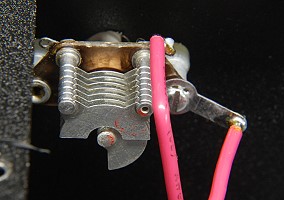 | Antenna Coupling Capacitor: This picture is a close-up of the antenna coupling capacitor. This capacitor has a minimum capacitance of 2 pf, and a maximum capacitance of 18 pf. In actual practice the entire range of the capacitor is used. Since both sides of the capacitor are above ground, the capacitor and capacitor shaft must be insulated from the chassis, and a plastic knob must be used on the shaft. My capacitor happened to have a plastic shaft, which is even better. To isolate it from the chassis, the capacitor is mounted to the front panel on white plastic standoff insulators which are just barely visible in the photo. The shaft passes through an oversized hole in the front panel. The oversized hole isn't really necessary with this capacitor, but is a must with a capacitor with a metal shaft. |