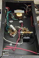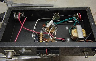 | Underchassis Side View: In this view underneath the chassis the filament transformer is visible at the top, and the filament power switch is visible at the top right. The regeneration control is at the top left, with the volume control just below it. At the extreme bottom left the antenna coupling capacitor can be seen. In the middle on the left is the tube socket, and the coil socket is on the right. The antenna connector is visible at the lower right. The pink wire in the photo is very heavy 12 gauge wire used to make the connections to the tuning capacitors and the antenna coupling capacitor. This wire is very stiff and greatly improves the tuning stability of the receiver when receiving CW and SSB signals. |