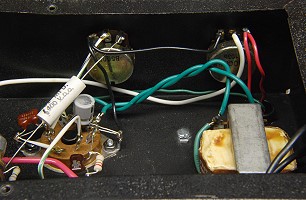 | Tube Socket and Volume and Regeneration Controls: This is a close-up taken from the same angle as the previous photo. The front panel is at the top and the rear panel is at the bottom. The tube socket can be seen at the left in the photo. The large white capacitor that passes over it and connects to the volume control is the audio coupling capacitor. The grey electrolytic capacitor directly to its right is part of the cathode bias circuit. The red 470 pf mica capacitor to the left of the white capacitor is the RF bypass capacitor. At top right is the regeneration control and the filament transformer is at the lower right. |