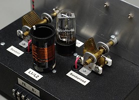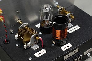 | Rear View #1 - Close Up: This is a close up of the top of the chassis. The bandset variable capacitor is on the left, while the smaller bandspread capacitor is visible to the right. The capacitors are bolted directly to the top of the chassis. In the center the plug in coil L1/L2 can be seen, with the 6SN7 tube in the back. The tickler winding L2 is at the bottom of the coil, and the larger main winding L1 is above the tickler winding. |
