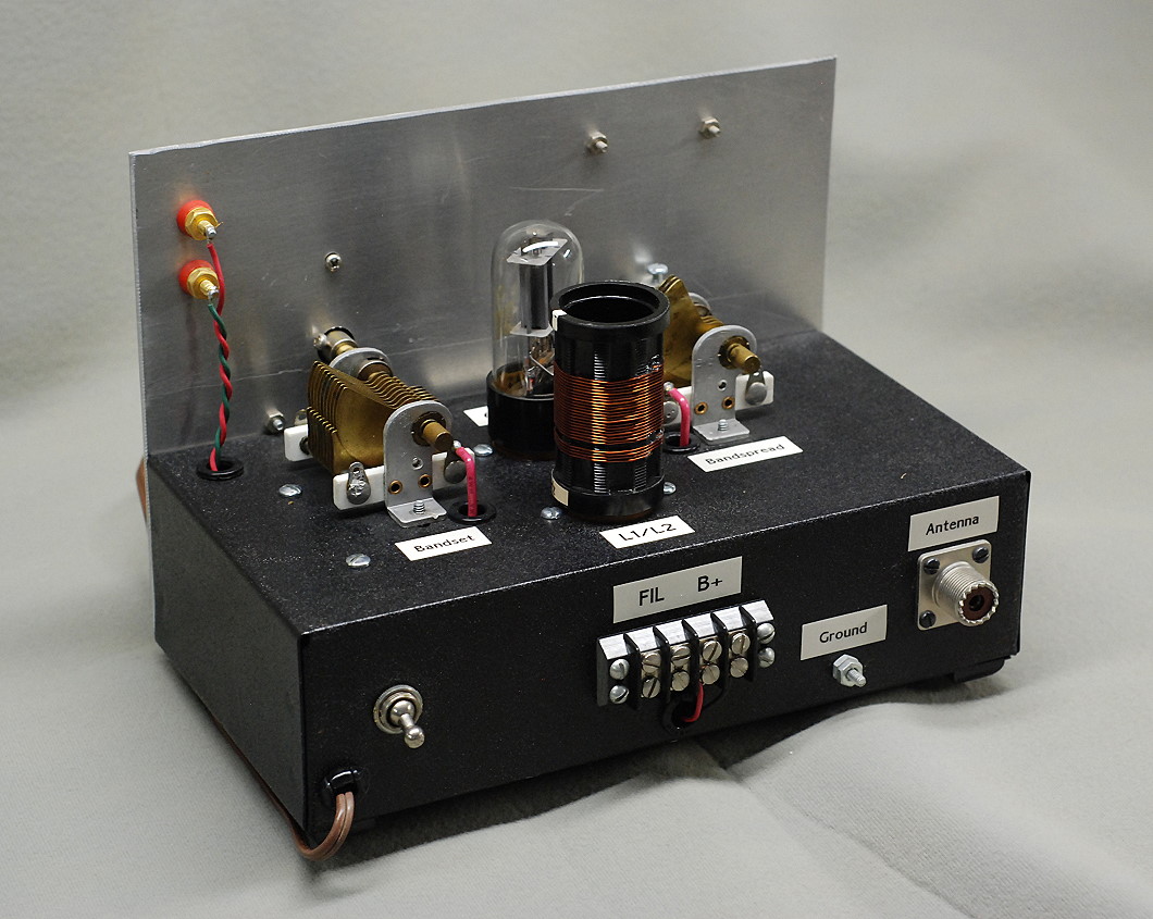 | Rear View #1: The receiver is built on a black sandpaper finished steel chassis 9 1/2" wide, 5" deep, and 2 1/2" tall that I found at a hamfest. The front panel is fastened to the chassis with the bottom of the front panel even with the bottom of the chassis. In this back view of the receiver, the filament power switch is visible on the back panel on the lower left. Note that the receiver still draws some current from the B+ battery even when the filament in off. Thus, it is important to disconnect the battery when the receiver is not in use. I later added a battery power switch to turn off the battery when not in use to avoid having to discconnect the battery. The 90 volt B+ battery is connected to the black terminal strip on the back panel. Originally, the filament transformer was external to the receiver, and was also connected to the terminal strip. Eventually, however, I decided to mount it inside the receiver, so the filament connections on the terminal strip are no longer used. The antenna is connected via the SO-239 connector on the right side of the back panel, and a ground wire is connected to the screw just to the left and below the antenna connector. |