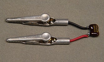 | Padder Capacitor Up Close: The padder capacitor is simply a 150 pf mica capacitor attached to a couple of alligator clips. The lead length should be kept as short as possible. This method is simpler and more effective than trying to use a switch to switch the padder in an out, since the extra wiring for the switch could affect the stability of the receiver. |