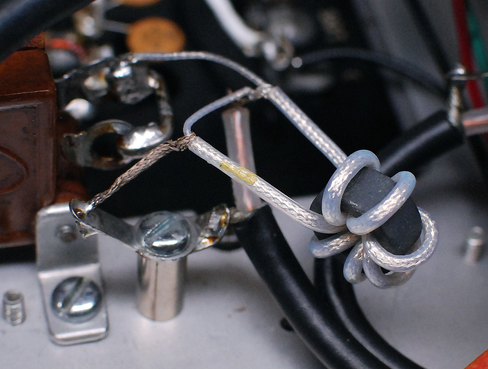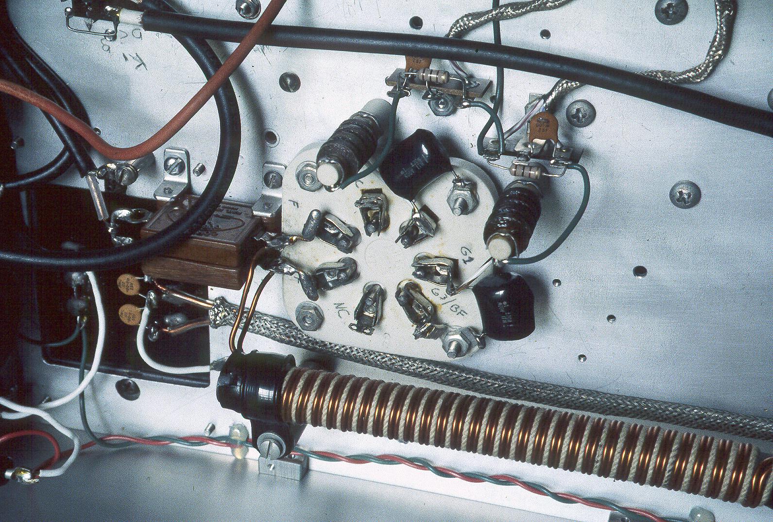 | Amplifier Tube Socket Close-up: Circuit wiring must be done carefully in amplifiers to avoid parasitic oscillations. Although the tube in this amplifier operates between 3.5 and 20 MHz, it can (and will) oscillate on spurious frequencies if given the opportunity to do so. In this view of the tube socket, notice how the grid bypass capacitors (the two, blue, dipped capacitors) are connected with very short leads to the tube socket pins and then grounded directly at the tube socket mounting lugs. Also notice how the G3/BF pin (for the beam forming plates) is grounded directly to the tube socket mounting lug. Such connections keep stray inductance to a minimum and help to avoid parasitic oscillations. The large brown capacitors on the left side of the tube socket connect the RF input to the cathode/filament of the tube. The large filament RF choke at bottom permits the filament voltage to reach the cathode/filament, while preventing the RF from flowing back to the filament supply. |
