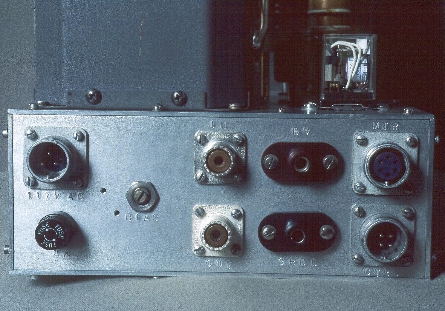 | Amplifier Rear Panel: The rear panel of the amplifier contains connections for the power supply, meter, and control circuits. The connector at the upper left supplies 117 VAC for the filament transformer. The BIAS adjustment just to the right sets the operating bias. The two SO-239 connectors in the middle of the rear panel are for RF INput and OUTput. To the right of them are the High Voltage (HV) and ground (GRND) connections for the 2000 volt plate supply, which is fed to the amplifier through a coaxial cable. The connector at the upper right (MTR) is for the meter panel, and the connector at the lower left (CTRL) provides connections for the bias supply and control circuits. The antenna changeover relay is visible on the top of the chassis at right. |