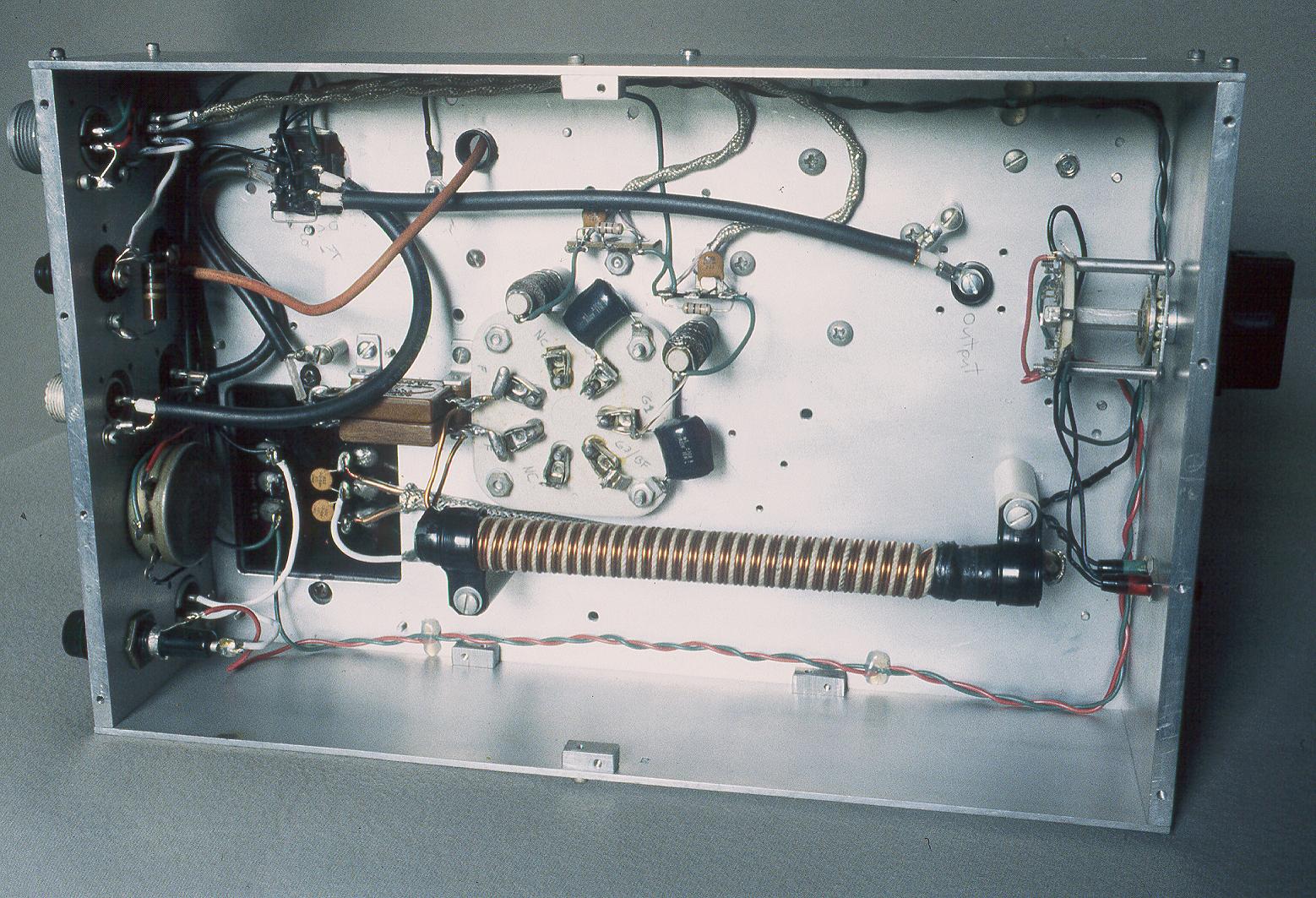 | Amplifier Underside: Compared to the power supply, the amplifier is very sparse underneath. In this photo the rear of the amplifier is to the left. The bottom of the antenna changeover/bias relay is visible at the upper left, and the bottom of the filament transformer can be seen at the lower left. The filament RF choke is the long coil at the bottom of the photo. The mode switch, which is mounted on the front panel, is visible at right, and just below it are the green and red standby/operate indicator lamps, also mounted on the front panel. Output from the plate tank circuit is taken through a feed-through bushing visible just behind the mode switch, and a coaxial cable carries the output to the changeover relay. |