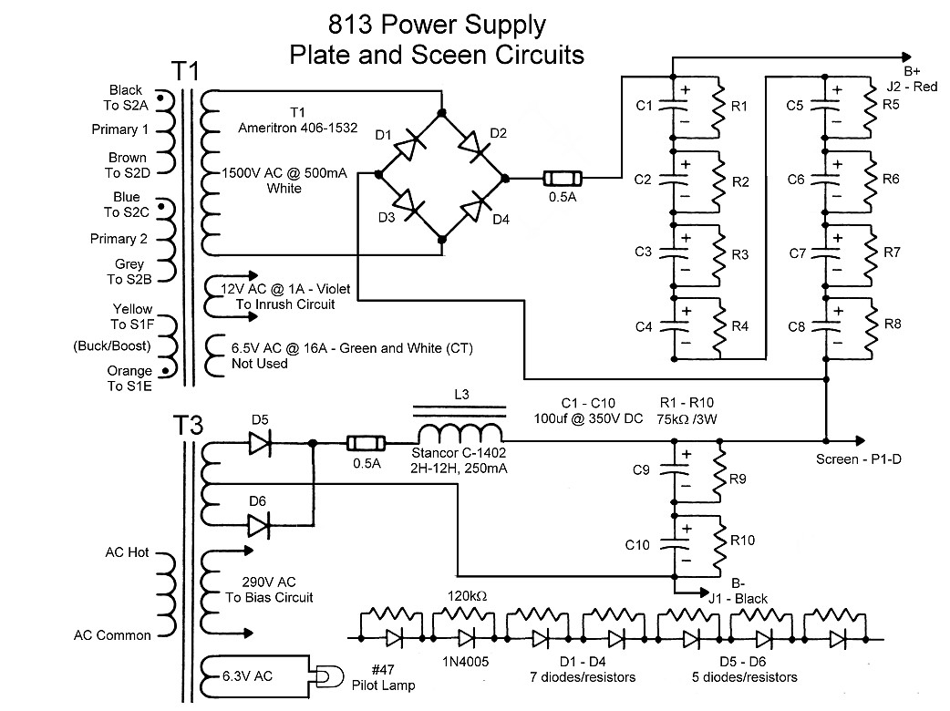 | Pilot Lamp: A #47 pilot lamp is used on the power supply, powered by a 6.3 volt secondary on T3. |