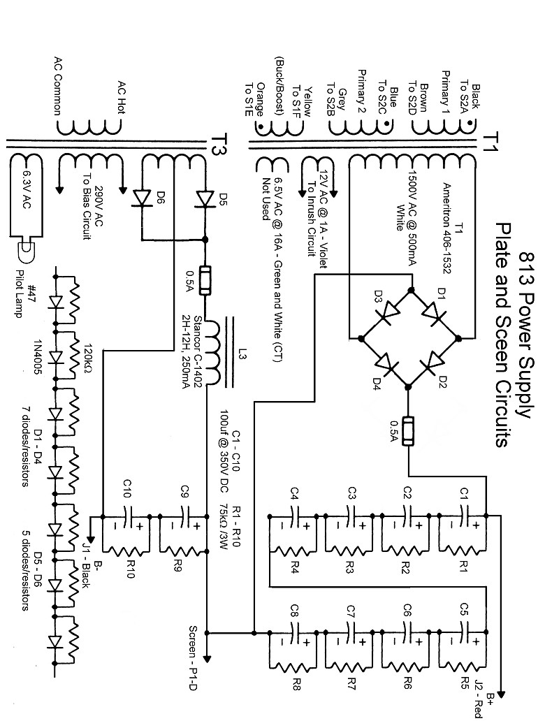 Rectifier: A conventional full wave, center-tapped circuit, powered by a center tapped secondary on T3, is used for the plate/screen supply. The negative output is the transformer center tap. The output of the diodes is fed through a 1/2 Ampere fuse to a choke input filter. Each of the diodes shown is actually a string of diodes in series. |