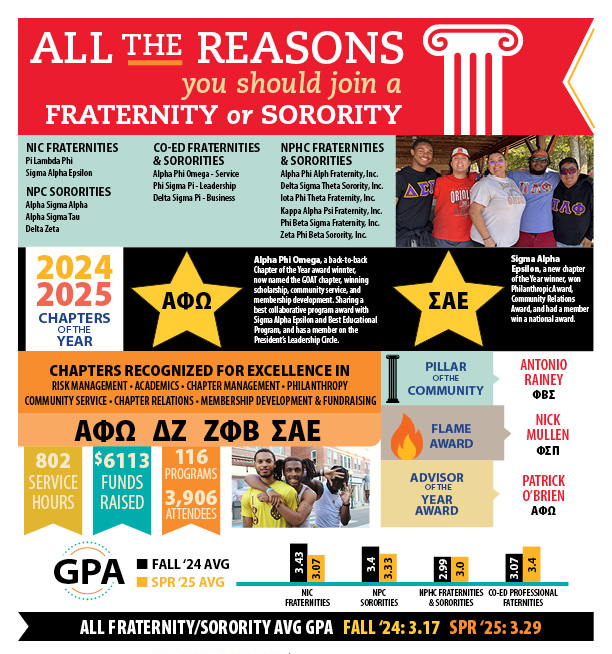 Breadcrumb Navigation Student Engagement Student Organizations Current: FRATERNITY AND SORORITY LIFE FAST FACTS Fraternity and Sorority Life Overview of Civic & Democratic Engagement